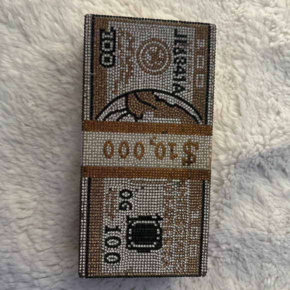 Sparkling clutch designed as a stack of $10,000 bills. Features intricate crystal detailing in black, gold, and silver.