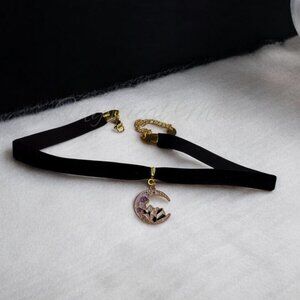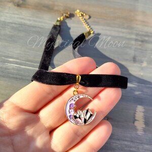 The centerpiece features a delicate crescent moon pendant adorned with geometric crystal design, creating a mesmerizing celestial aesthetic. The soft velvet ribbon sits comfortably against the neck, while the gold-toned hardware adds a luxurious finish. An adjustable chain extender ensures the perfect fit for various neck sizes. The pendant's purple and gold color scheme perfectly complements the classic black velvet band, making it an ideal accessory for both everyday wear and special occasions.