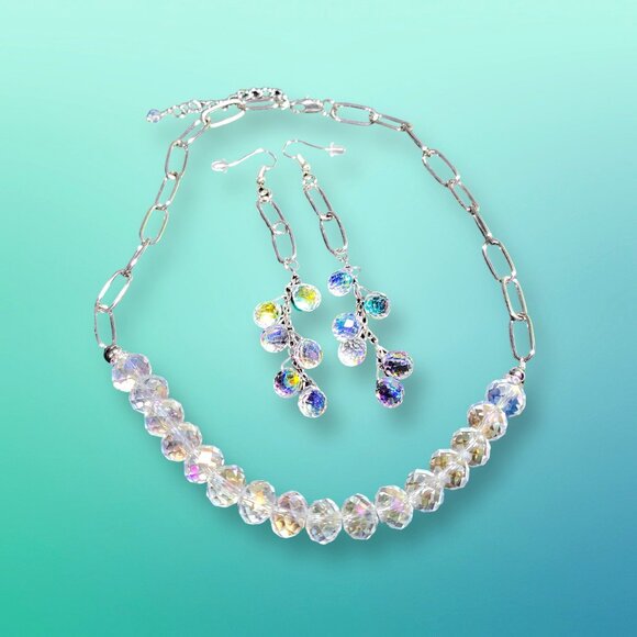 Sparkling necklace and earring set perfect for the holidays or anytime! Handmade with multi-faceted crystal beads and silver chain. Necklace is 16" with a 2-inch extender and the dangle earrings are 4" long. Visit us at: https://prettybeaddezigns.etsy.com