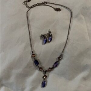 Crystal necklace & earring set blue & taupe colored crystals, adjustable chain length