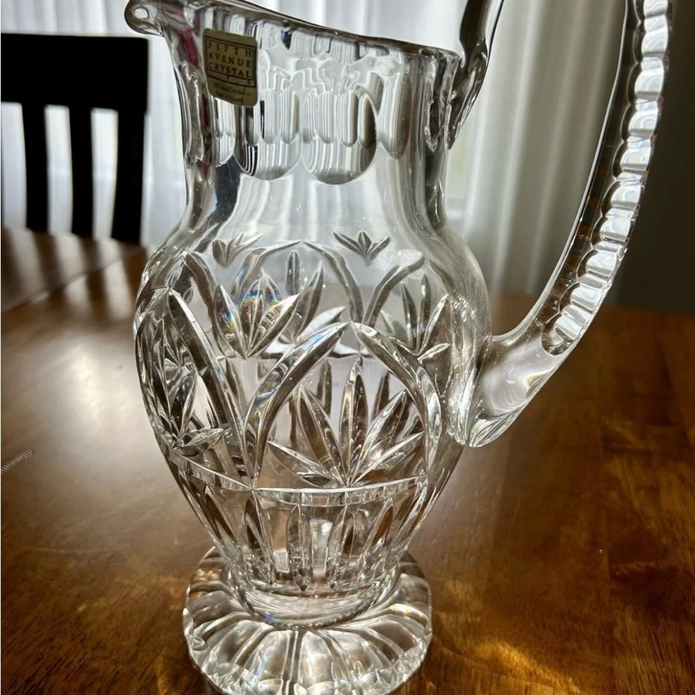 Vintage Fifth Avenue crystal pitcher with intricate leaf design. Perfect for serving beverages in style.