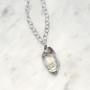 Natural quartz pendant necklace features clear pointed crystal on 37” silver chain. Adjustable length, lobster clasp closure. Note slight color difference between chain and top silver detail on crystal - very minor, but it’s affixed via jump ring so easy to swap if you wish. In excellent preowned condition!