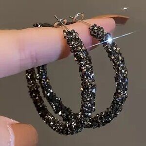 These hoop earrings feature a sleek black rhinestone design, offering a sophisticated touch for formal events or professional gatherings. Lightweight yet striking.