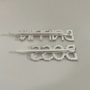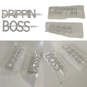 “DRIPPIN” and “BOSS” Crystal Rhinestone Studded Metal Hair Pin Accessories. Both included. New in package, boutique, no tag. Add some extra glam to your hairstyle with these stylish hair accessories. Featuring 'DRIPPIN' and 'BOSS' designs, these rhinestone hair pins are perfect for adding sparkle to any look. Great for both casual and formal occasions. Add style to hair. Size of standard hairpin with large words.