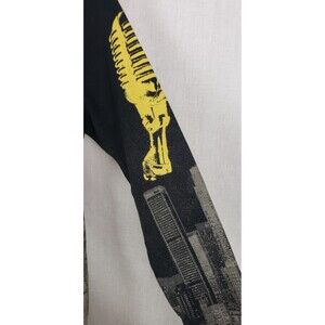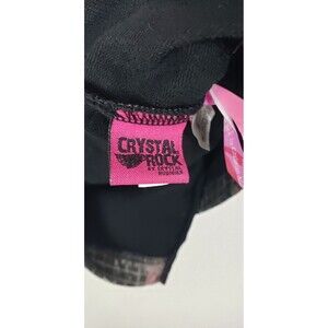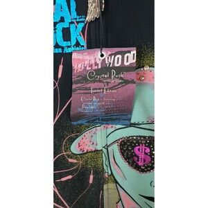 This is a Christian Audigier Crystal Rock Jacket in size XS. It features a black cotton material with long sleeves, a zip closure, and beaded rhinestone accents. The jacket has a hood, full zip, and pockets, making it suitable for travel or casual wear. The style is described as Y2K Hip Hop, with a mix of hipster, art, biker, punk, colorful, grunge, classic, 90s, and retro themes.