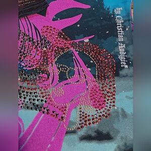 Make a bold statement in this Crystal Rock by Christian Audigier Limited Edition Hoodie in a stunning ombré aqua blue with striking pink and purple graphics. This rare, collectible zip-up hoodie is a true Y2K gem, featuring eye-catching rhinestone embellishments and exclusive artwork on soft, stretchy 95% cotton and 5% spandex fabric.