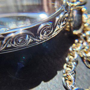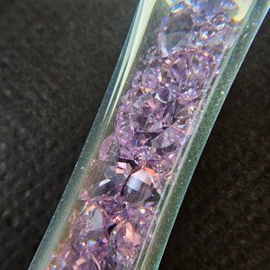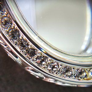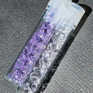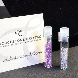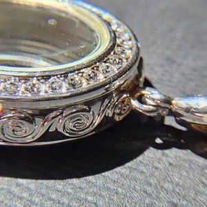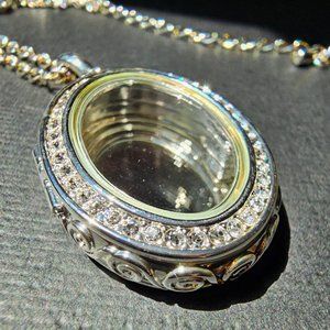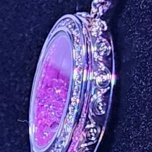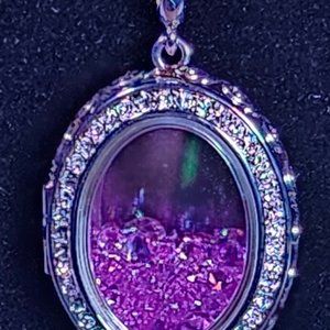 Wow! What a stunning piece. Sparkle for days! Swarovski crystals also line the outer face of the pendant for more bling factor. Rhodium plating. 20" chain with 3" extender. Two vials of crystals to choose from to compliment your style; white/purple. Loose crystals are or varying sizes and the locket is only meant to hold the contents of one vial of crystals at a time.