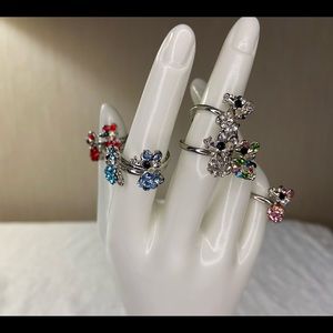 Cute crystal mouse rings, all silver toned with a variety of crystal colors to choose from. Size 6 1/2 shown but they are adjustable to smaller or bigger sizes. Color choices: 2 red, 1 blue, 1 light blue, 2 clear, 1 pink, 1 multi-color. Specify color in comments when purchased.