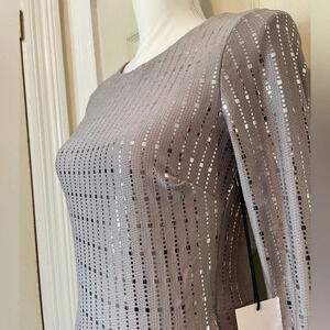 Crystal Sky Gray Metallic Style Long Sleeve Open Back Dress. Women’s size small. New with tag. Some stretch. One hanger loop is attached at the shoulder, instead of interior (can be tucked in or possibly gently cut off). One metallic piece on shoulder is lifted, could be trimmed or left as is. See all photos.
