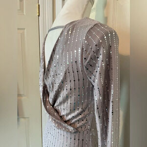 Crystal Sky Gray Metallic Style Long Sleeve Open Back Dress Women’s Small NWT