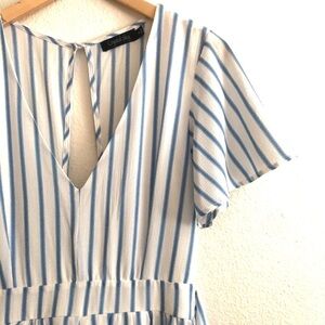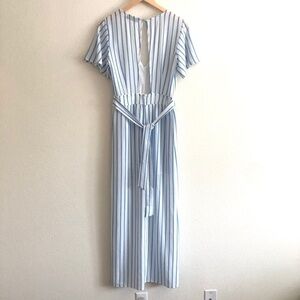 Take a vacation this winter and show off this stunning striped romper! A low V cut shorts romper with cute flowy sleeves. Open back, tie, and long skirt attached! Fabric underneath so it’s not see through!