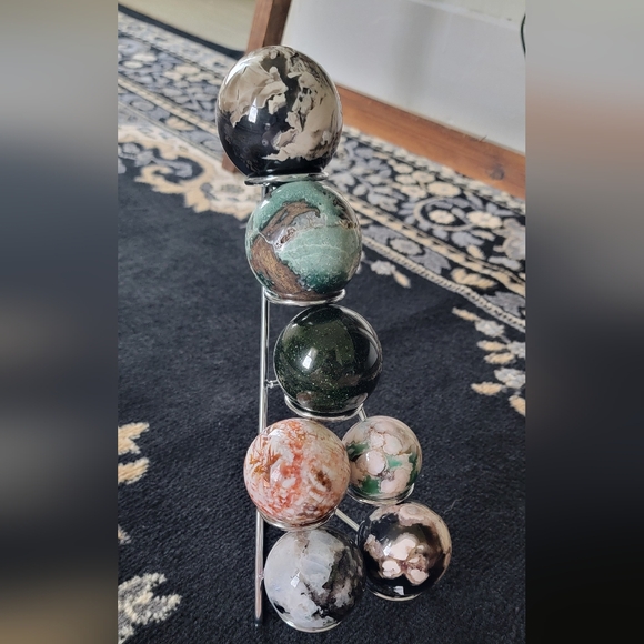 From the bottom up: moonstone and black agate, red and cream colored sphere(don't remember name) and green agate, green sandstone, I don't remember what the teall and brown one is called, and the very tip is another black agate.