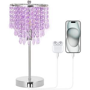 Crystal Table Lamp 3 Way Dimmable Touch Nightstand Light with USB Ports Lavender