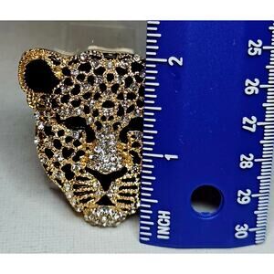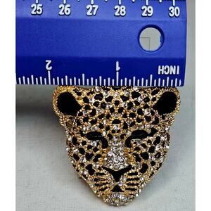 Crystal Tiger Head New! Gold/black rhinestones Brouch. Bling. Mob wife. Stylish Granny. Cruise. Showoff. Standout. Unique. Rare. Sparkling Brouch. Fast Fashion Pin/Brouch. Never used. Must see All pictures for the details and measurements. Offers Welcome. Ships Fast.