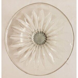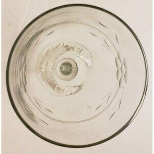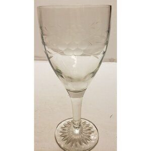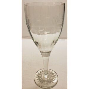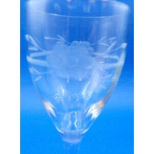 This crystal wine clear is etched with a ring and flowers around the cup and has a starburst pattern on the bottom. It measures 3" diameter and 7" tall.