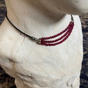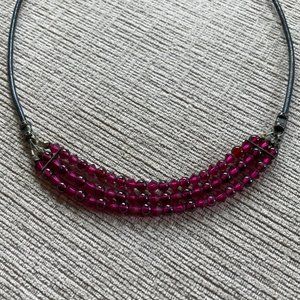 Selling this Crystal and Leather Choker Necklace. The beads are Preciosa Czech crystals. The color is a dark pink/purple. The length from end to end is 16 and 1/3 inches.