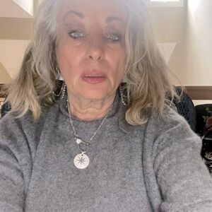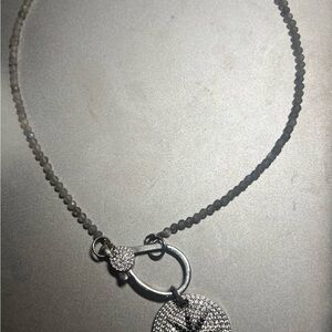 This elegant silver pendant necklace features a stunning circular design with sparkling accents. Perfect for adding a touch of sophistication to any outfit. Labradorite color crystals attached to an oversize clasp with a rhinestone drop approximately 1 inches in length beads measure around 15 inches in length
