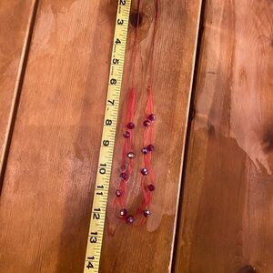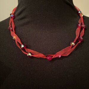 Swarovski crystals beaded o to gorgeous red ribbon and finished of with a macrame adjustable clasp. I bought two of these from an artist in New Mexico and wore both. I gifted the other one to someone who loved it. Here, some lucky person gets the second. Came be shortened to choker length 14” and lengthened to about 24”. Perfect Condition