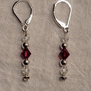 They are made with bicone crystals that are garnet and clear. Sterling Silver balls are also used.