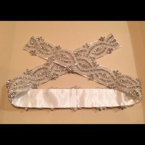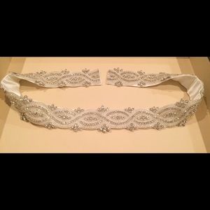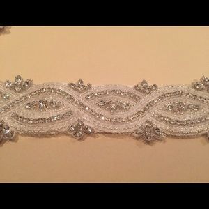 Beautiful sash with crystals and clear beading with a white satin ribbon backing. Never worn and kept protected in a box waiting for its next owner. Purchased from Jaehee Bridal in Englewood NJ. Length 27.5" and width 1.5". The ends of the ribbon have been cut off because I was going to have the sash sewn directly into my wedding dress. The crystals can be separated from the ribbon backing and you can easily stitch it onto a different sash if desired.