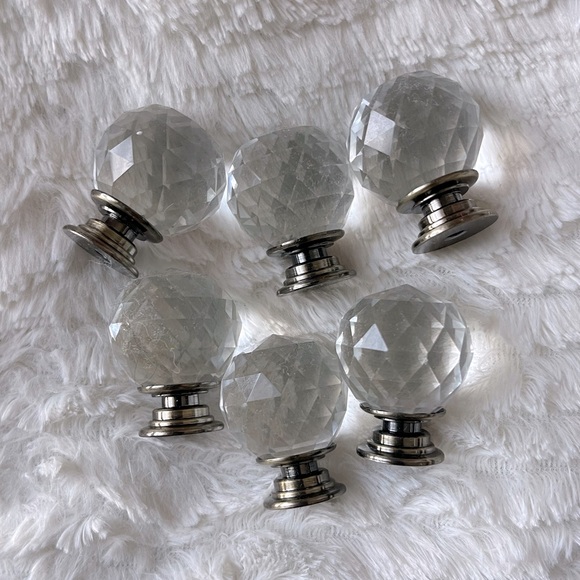 Six crystal cabinet knobs with hardware. They did not fit my two-hole cabinet project. Really lovely and I kept them a long time hoping to use them. Alas!