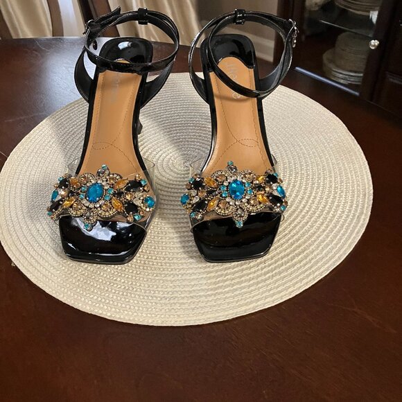 Square toe, memory foam/latex insole. Clear black patent ankle strap, 3 inch heel, Size 10m