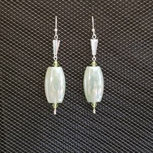 Dangly earrings made with clear faceted glass crystals, clear green faceted bicone beads, and light green iridescent glass suspended from silver plated perfect balance fishhook ear wires. Tiny silver ball dangling from the bottom. Weight: 0.1 oz/4 grams each. Ear wires are silver plated and nickel free. 3.5 inches from the top of the ear wire. Brand new, never worn NWT. Handmade by me, the SparklieFiend!