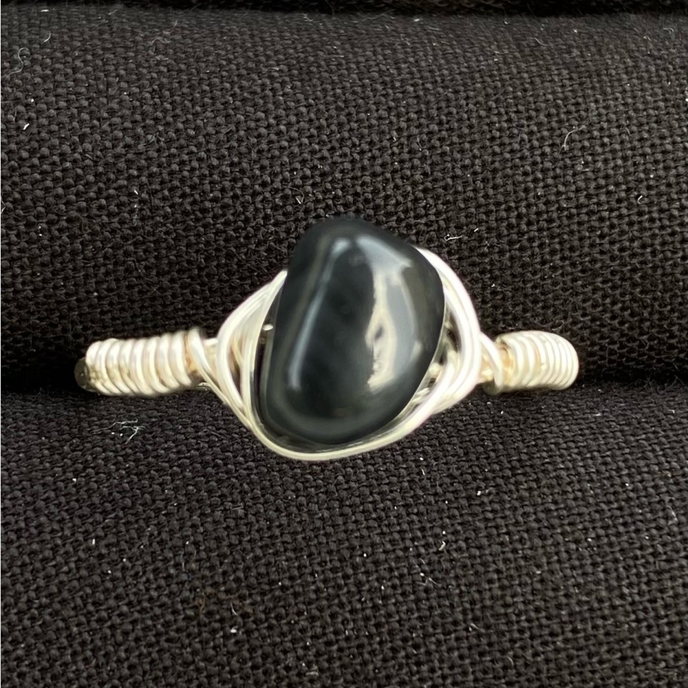 Black obsidian crystal ring. Tarnish resistant silver wire. You choose size.