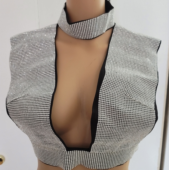 A Rhinestone crop top that have a plunging neckline