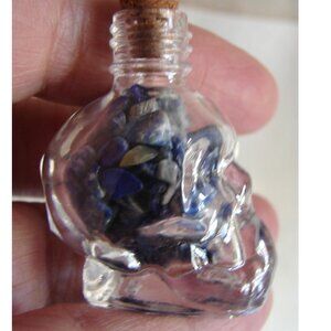 Seven 1 3/4" tall skull-shaped jars with assorted stones.