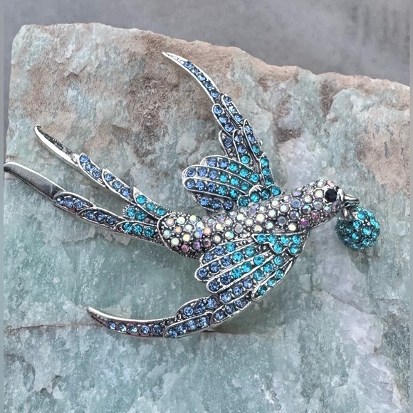 Let your style take flight with this breathtaking vintage-inspired swallow brooch, encrusted with sparkling aqua blue, lavender, and iridescent AB rhinestones. Sculpted in silver-tone metal, this graceful bird clutches a glittering turquoise orb, symbolizing beauty in motion. Whether perched on a lapel, scarf, or hat, this eye-catching pin adds elegance and whimsy to any outfit.