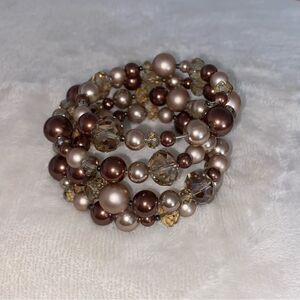 This bracelet has been crafted of high quality glass bead and crystal beads. It has a wire that creates it to spiral around the wrist so fits any size.