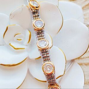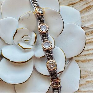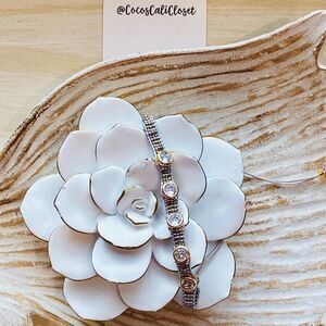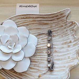Crystal Seed Bead Boho Woven Adjustable Friendship Bracelet NWT is a brand new item without tags but in original packaging. Three rows of silver/gunmetal/charcoal gray seed beads are woven together with 5 crystal accents bezel set in gold tone metal. Bracelet is adjustable for larger wrists up to approximately 10” and width is approximately 0.25” (please refer to photos). It can easily be worn alone or with other bracelets.