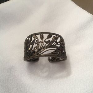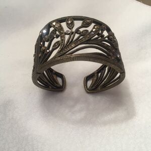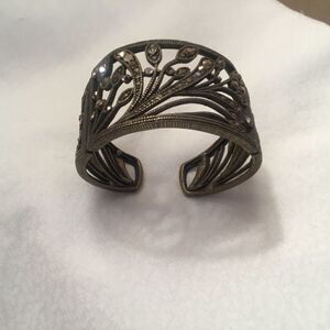 This brasstone metal bracelet has a leafy pattern and is imbedded with brown and cognac colored crystals. For a smaller wrist, up through size 7. It measures 1 1/4” at its widest spot. $8 each of bundle 3 of same price for $15 and save.