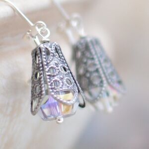 Look like you stepped out of The Renaissance, or Medieval Europe with these Old World Style Earrings. Crystal clear faceted Czech glass teardrops, with a fire-polished finish, are adorned with antique copper filigree cone bead caps to create these elegant earrings.