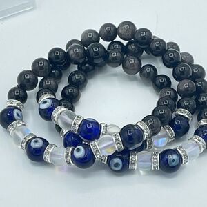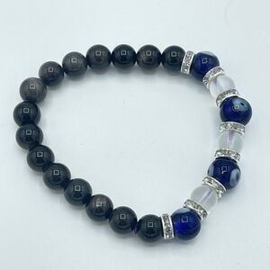 Crystal beaded stretch bracelet ONE NEW evil eye silver obsidian reiki meditatio