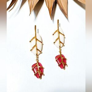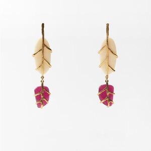 Pink and white exaggerated boho dangle earrings in gold tone hardware