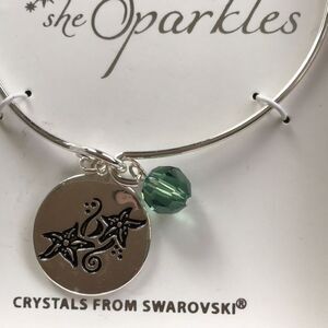 Crystale by L&J silver bangle bracelet. hook/loop closure. Two charms: black embossed starfish pattern on silver disc and erinate (light gray-green) Swarovski faceted crystal bead. New, in box. Nonsmoking home.