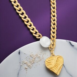 18K gold-plated necklace, stainless steel jewelry, Cuban chain necklace, heart charm necklace, faux pearl necklace, gold statement necklace, trendy gold necklace, Cuban link chain, fashion jewelry, women's gold jewelry, gold pendant necklace, elegant necklace, chunky chain necklace, gold chain necklace for women, pearl accent necklace, gift for her, gold jewelry for layering, bold necklace, gold Cuban necklace, pearl charm, gold heart pendant, luxury necklace, durable jewelry, everyday jewelry, versatile necklace, gold accessories, chocker necklace, fashion necklace