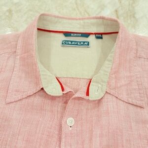 The Cubavera Men's Slim Fit Linen Blend Short Sleeve Button Down Shirt in size XL features a stylish red and white striped pattern, making it a versatile addition to any man's wardrobe. Made from a lightweight and breathable linen blend material, this shirt offers both comfort and style. The slim fit design and button-up closure add a modern touch to this classic button-down shirt, perfect for casual occasions. Shirt is in excellent, pre-loved condition!