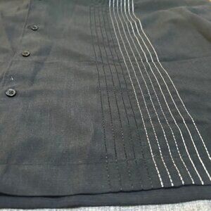 This tropical-style shirt features a point collar and embroidered striped panels down the front for an eye-catching, Latin-inspired look.