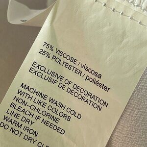 Very classy white shirt with pleated seams running down shirt with stitching. Sleeve has a button it. Made of 75% viscose 25% polyester, machine washable. Smoke free home.