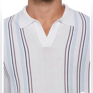 Stylish white shirt with blue and purple stripes. Features a classic collar and short sleeves. Perfect for casual wear.