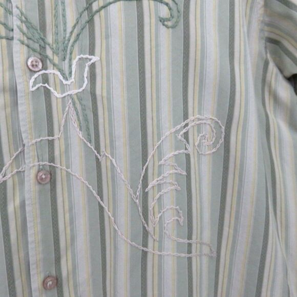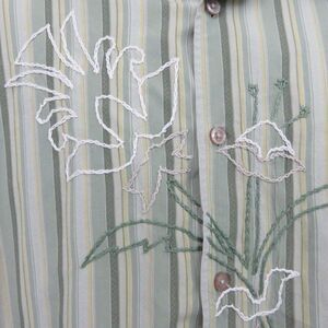 This is a super handsome 100% cotton Cubavera shirt with embroidered leaves and flowers over a multi-toned green stripe: