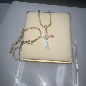 Cubic Zirconia Cross Pendant Necklace With Rope Chain Stainless Steel Gold Plate