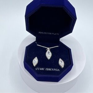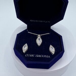 Cubic Zirconia Navette Pendant Necklace & Drop Earrings Set in Fine Silver Plate