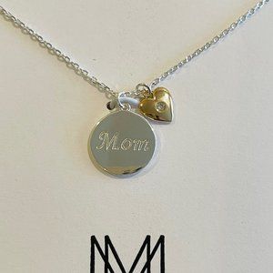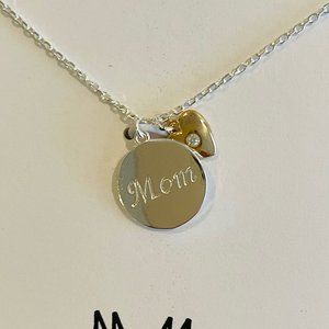 A silver-plated "mom" on a round disc pendant flaunts smaller dangling gold-plated disc charm with center clear cubic zirconia stone.