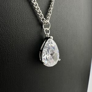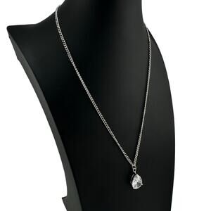 Cubic Zirconia Teardrop Solitaire Prong Set Silver Tone Elegant 18" Necklace