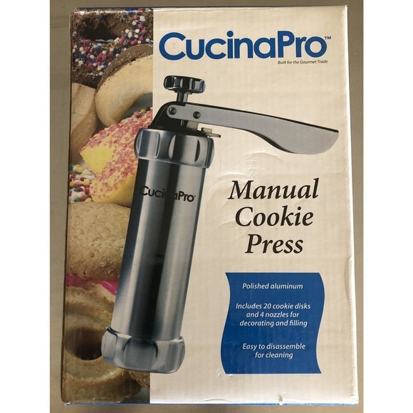 CucinaPro Cookie Press Set with 20 Discs and Four Icing Nozzles. Condition is used, but looks as never used. Shipped with USPS Priority Mail.