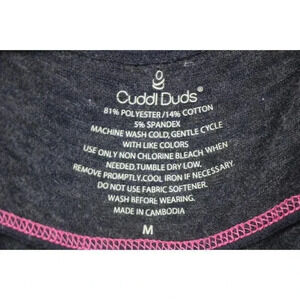 This is a Cuddl Duds Gray 3/4 Sleeve Sleep Shirt that is a size Medium. It is 81% Polyester, 14% Cotton, and 5% Spandex. Laying flat, it measures: Armpit to armpit-20.5" and the length is 36". It is very soft. It does have some light pilling but in good condition.